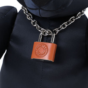 The point is the brass chain and the PADLOCK collar wrapped in glass leather with engraving. The body has an original tag with the year of manufacture embroidered on it.