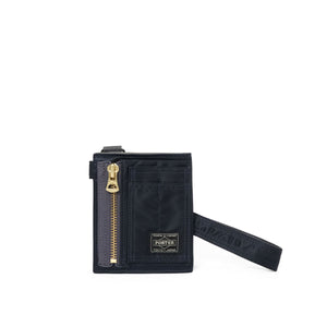 This wallet is based on the cigarette pocket on the left sleeve of a flight jacket. The specifications used for cigarettes and pens have been arranged as a coin purse, the zippered pocket, the two pen holders, and the other one as a card pocket. There are multiple card slots on the interior, making it compact yet with plenty of storage space. A removable strap is included, which can be used as a hand strap, or attached to a belt or bag.