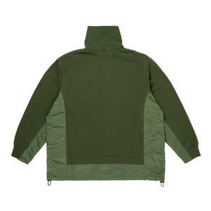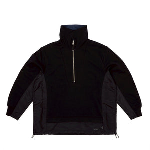 half-zip sweatshirt is a unique collaboration piece, combining nylon and sweatshirt fabric. By tightening the hem cord, the silhouette changes, allowing for a variety of looks.