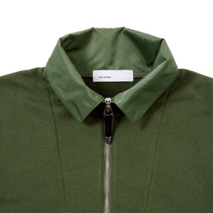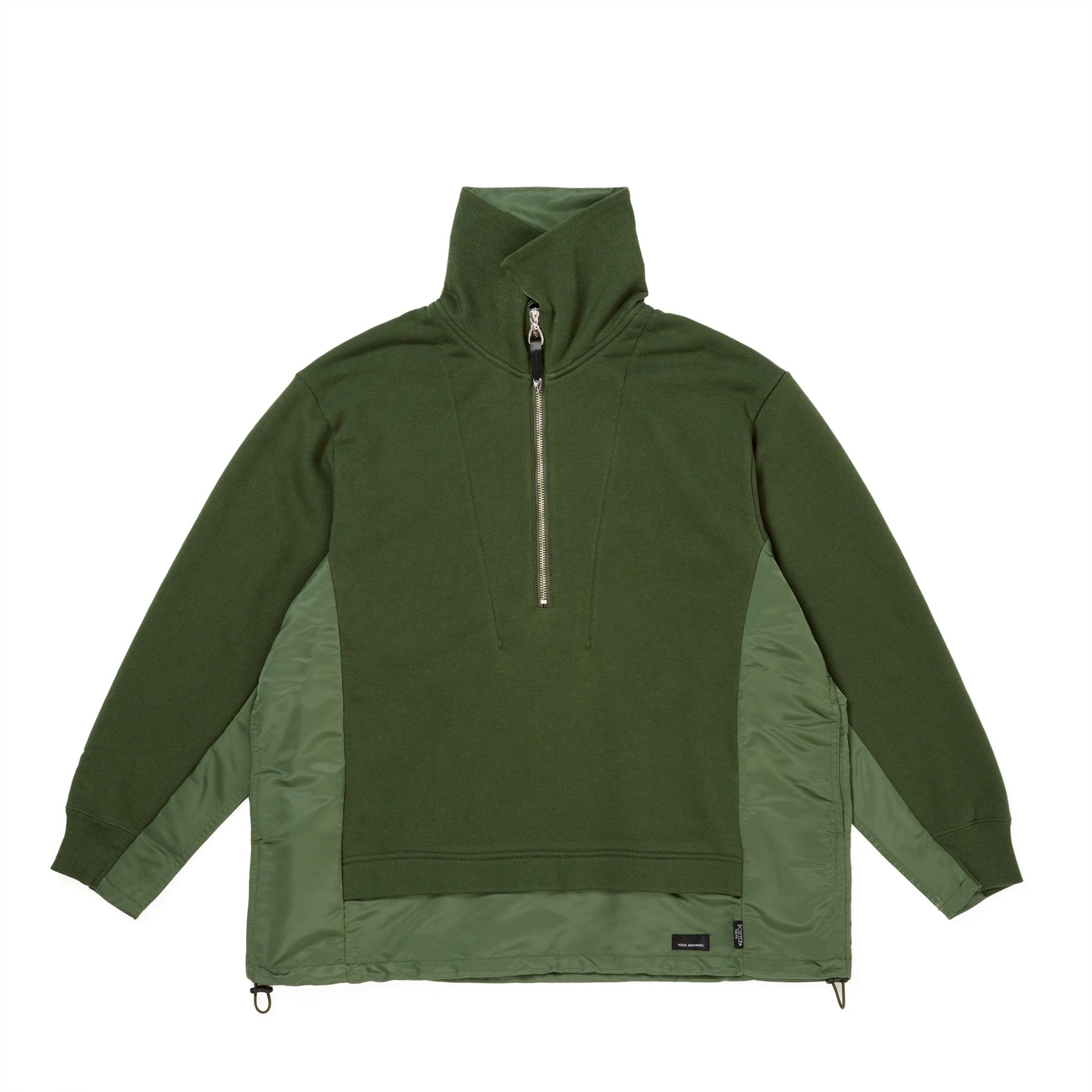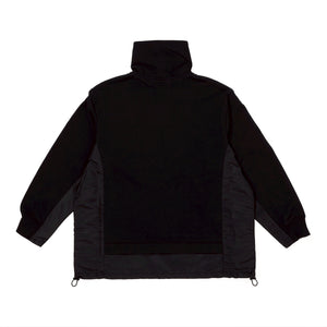 half-zip sweatshirt is a unique collaboration piece, combining nylon and sweatshirt fabric. By tightening the hem cord, the silhouette changes, allowing for a variety of looks.