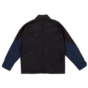 The nylon blouson, a unique collaboration piece, combines nylon and polyester cotton. Two chest pockets and a zippered pocket on the front provide ample storage for small items.