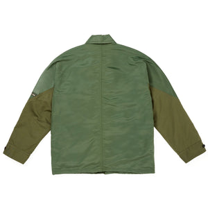 The nylon blouson, a unique collaboration piece, combines nylon and polyester cotton. Two chest pockets and a zippered pocket on the front provide ample storage for small items.