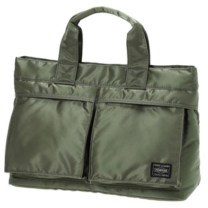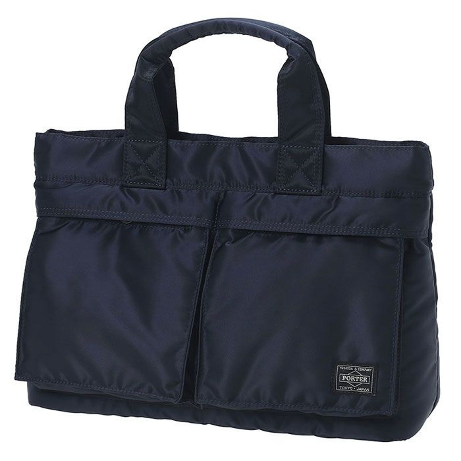A handbag type tote bag with an impressive horizontal form. There are two tanker-like front pockets on the front, and the height and width of the gusset can hold a 500ml plastic bottle, so it is possible to store wide luggage such as a lunch box.